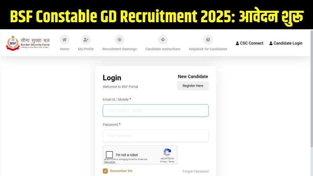 BSF Constable GD Recruitment 2025 Apply Online: बॉर्डर सिक्योरिटी फोर्स (BSF) ने ग्रुप-सी कांस्टेबल (जनरल ड्यूटी) पदों पर भर्ती के लिए आवेदन प्रक्रिया शुरू कर दी है। इच्छुक और पात्र उम्मीदवार 16 अक्टूबर 2025 से बीएसएफ की आधिकारिक वेबसाइट rectt.bsf.gov.in पर जाकर ऑनलाइन आवेदन कर सकते हैं और आवेदन करने का डायरेक्ट लिंक और प्रक्रिया की पूरी जानकारी यहां दी गई है।