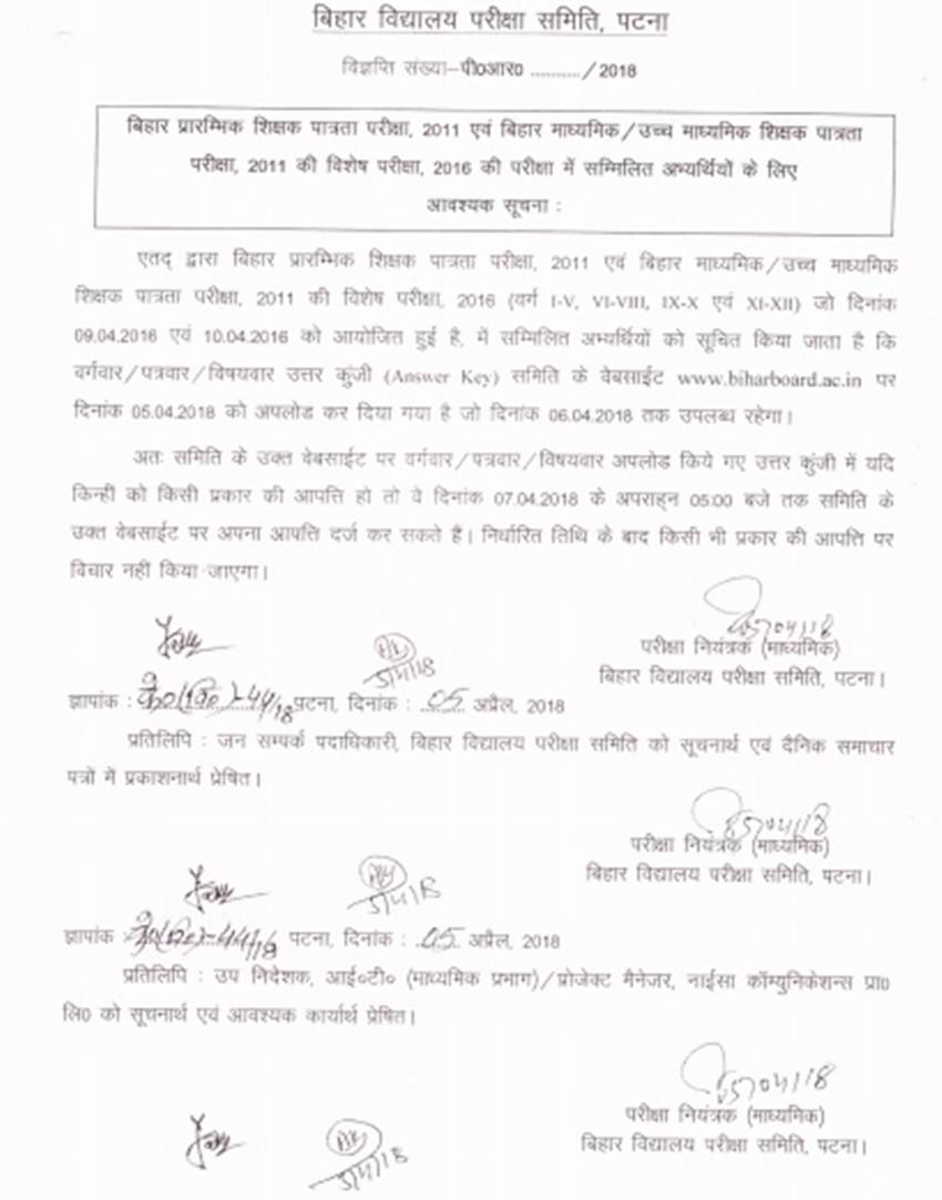 बिहार स्कूल एग्जामिनेशन बोर्ड (BSEB) ने बिहार शिक्षक पात्रता परीक्षा (Bihar TET 2016) की उत्तर कुंजी जारी कर दी है। अभ्यर्थी इसे ऑनलाइन आसानी से चेक कर सकते हैं। BSEB की वेबसाइट पर नोटिफिकेशन के मुताबिक, उत्तर कुंजी वेबसाइट पर गुरुवार को अपलोड की गई और यह शुक्रवार यानी 6 अप्रैल 2018 तक ही वेबसाइट पर उपलब्ध रहेगी। वहीं उत्तर कुंजी पर आपत्ति आप 7 अप्रैल 2018 शाम 5 बजे तक ही दर्ज करा सकते हैं। Bihar TET या BTET परीक्षा 09.04.2016 एवं 10.04.2016 को आयोजित हुई थी। अधिसूचना के मुताबिक निर्धारित समय के बाद किसी भी आपत्ति पर विचार नहीं किया जाएगा। चलिए अब जानते हैं उत्तर कुंजी देखने का तरीका।