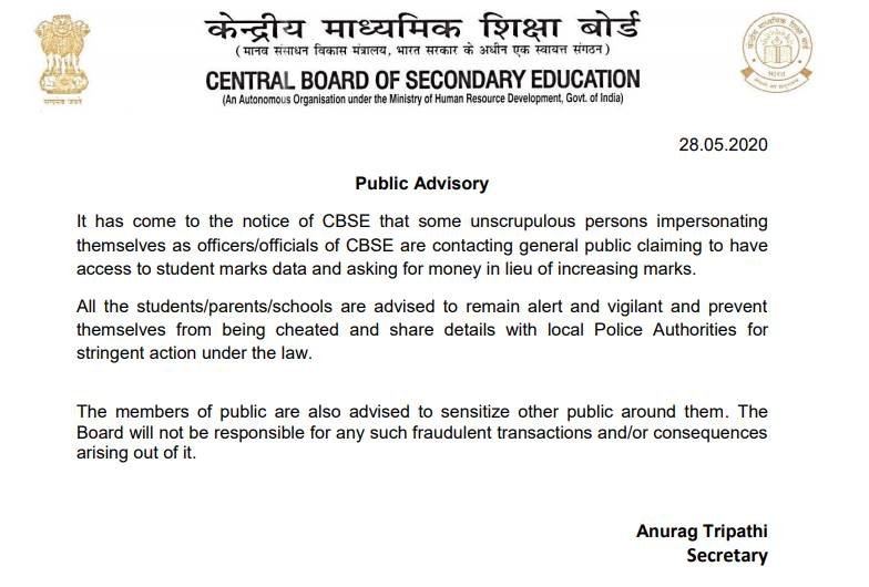 केंद्रीय माध्यमिक शिक्षा बोर्ड (CBSE) ने बड़े फर्जीवाड़े की आशंका के मद्देनजर एक नोटिस जारी किया है। इस नोटिस के माध्यम से बोर्ड सभी 10वीं और 12वीं के छात्रों और अभिभावकों को फर्जीवाड़ा करने वालों से बचने के लिए सावधान किया है। बताया जा रहा है कि कुछ लोग छात्रों के नंबर बढ़ाने के लिए पैसे मांग रहे हैं और अपना अकाउंट नंबर भी दे रहे हैं। बोर्ड ऐसे जालसाजों से बचने के लिए आगाह किया है। साथ ही, बोर्ड ने ऐसी घटना के जानकारी तुरंत लोकल पुलिस स्टेशन में देने की सलाह भी दी है। पुलिस विभाग मामले की उचित कानूनी जांच करेगी।
