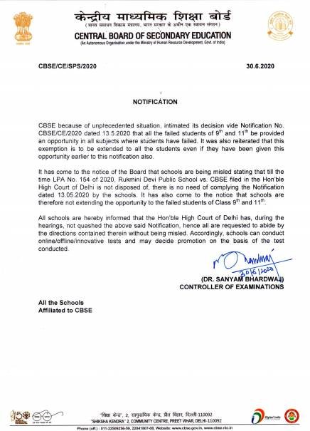 सीबीएसई ने स्कूलों को यह भी याद दिलाया है कि हाल ही में दिल्ली उच्च न्यायालय की सुनवाई का 13 मई को दिए गए नोटिस पर कोई प्रभाव नहीं पड़ा है और सभी छात्रों को अपनी परीक्षा में बैठने का मौका मिलना चाहिए, यदि वे असफल हो गए हैं और अपने स्कोर में सुधार कर सकते हैं।