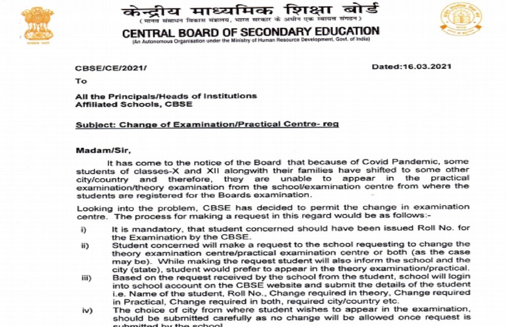 ऑफिशियल नोटिफिकेशन के अनुसार कोरोना महामारी के कारण, कक्षा 10, कक्षा 12 के कुछ छात्र अपने परिवार के साथ किसी अन्य शहर या देश में शिफ्ट हो गए हैं इसलिए, वे उस परीक्षा केंद्र से प्रैक्टिकल एग्जाम या थ्योरी एग्जाम के लिए उपस्थित नहीं हो सकते हैं जहां से छात्र बोर्ड परीक्षाओं के लिए पंजीकृत हैं। छात्रों को अपने संबंधित स्कूलों में परीक्षा केंद्र बदलने का अनुरोध करते हुए, स्कूल को उस शहर के बारे में सूचित करना होगा जहां से वे आगामी बोर्ड परीक्षा के लिए उपस्थित होना चाहते हैं।