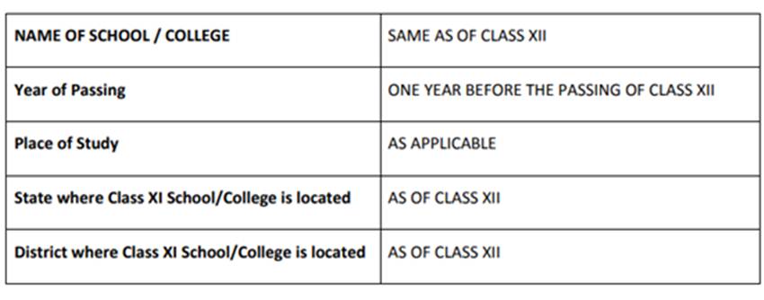 ऐसे में, छात्रों की सुविधा के लिए सीबीएसई ने नए निर्देश जारी किए। इनके मुताबिक, छात्रों को फॉर्म में अपनी 11वीं कक्षा की डिटेल्स इस टेबल के मुताबिक भरनी होगी: स्कूल/कॉलेज का नाम- 12वीं कक्षा वाला; पासिंग ईयर- 12वीं कक्षा पास करने से एक साल पहले वाला; स्टडी प्लेस- जैसा लागू हो; राज्य जहां 11वीं कक्षा का स्कूल/कॉलेज स्थित हो- कक्षा 12वीं का; जिला जहां 11वीं कक्षा का स्कूल/कॉलेज स्थित हो- कक्षा 12वीं का।