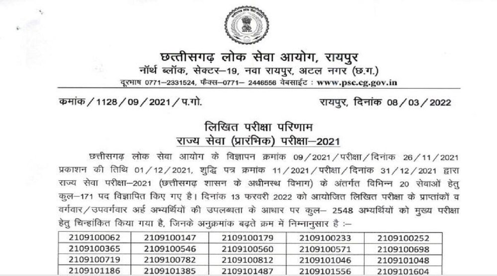 CGPSC State Service Result 2022: छत्तीसगढ़ लोक सेवा आयोग ने राज्य सेवा प्रारंभिक परीक्षा 2021 का रिजल्ट घोषित कर दिया है. अभ्यर्थी CGPSC की आधिकारिक वेबसाइट psc.cg.gov.in जारी जारी रिजल्ट को चेक कर सकते हैं। प्रारंभिक परीक्षा का आयोजन 13 फरवरी 2022 को किया गया था।