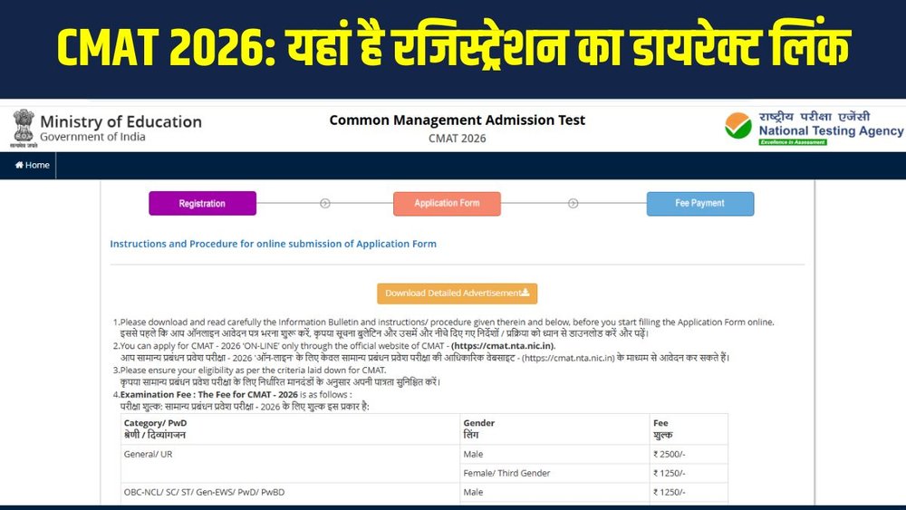 नेशनल टेस्टिंग एजेंसी (NTA) ने CMAT 2026 के लिए ऑनलाइन पंजीकरण प्रक्रिया शुरू कर दी है। जो उम्मीदवार कॉमन मैनेजमेंट एडमिशन टेस्ट (CMAT) 2026 में आवेदन करना चाहते हैं, वे आधिकारिक वेबसाइट cmat.nta.nic.in पर जाकर सीधे आवेदन कर सकते हैं, जिसका डायरेक्ट लिंक यहां दिया गया है।