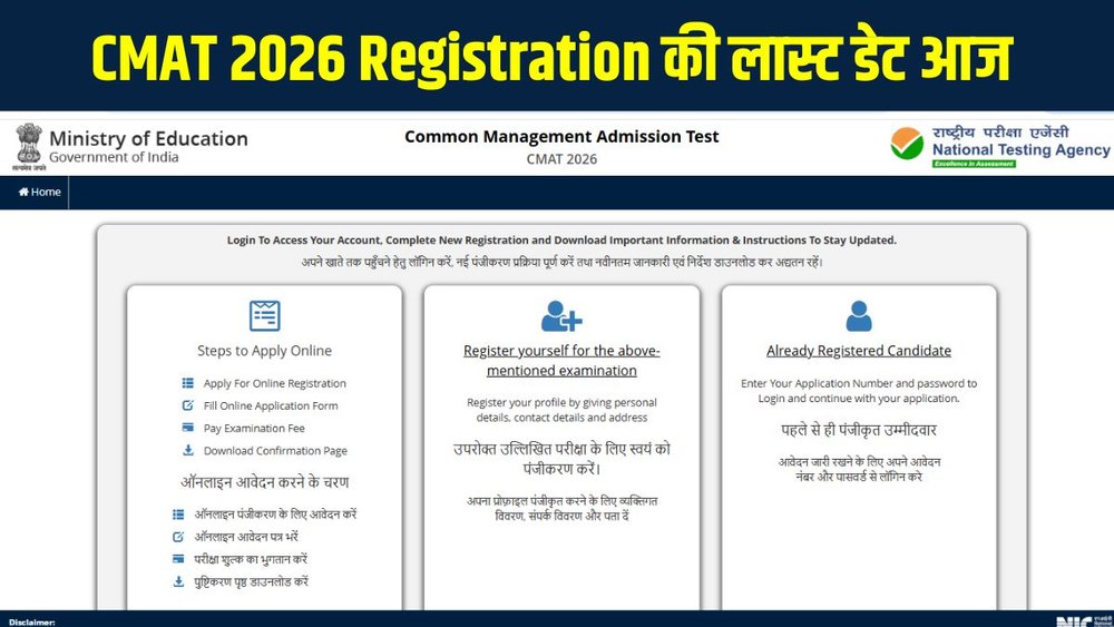 नेशनल टेस्टिंग एजेंसी (NTA) आज, 17 नवंबर 2025 को कॉमन मैनेजमेंट एडमिशन टेस्ट (CMAT) 2026 के लिए ऑनलाइन पंजीकरण प्रक्रिया बंद कर देगी। जिन उम्मीदवारों ने अभी तक आवेदन नहीं किया है, वे आधिकारिक वेबसाइट cmat.nta.nic.in पर जाकर अपना फॉर्म भर सकते हैं। आवेदन शुल्क जमा करने की अंतिम तिथि 18 नवंबर 2025 है। इसके बाद करेक्शन विंडो 20 नवंबर से 21 नवंबर 2025 तक खुलेगी, जिसमें उम्मीदवार अपने फॉर्म में आवश्यक सुधार कर सकेंगे।
