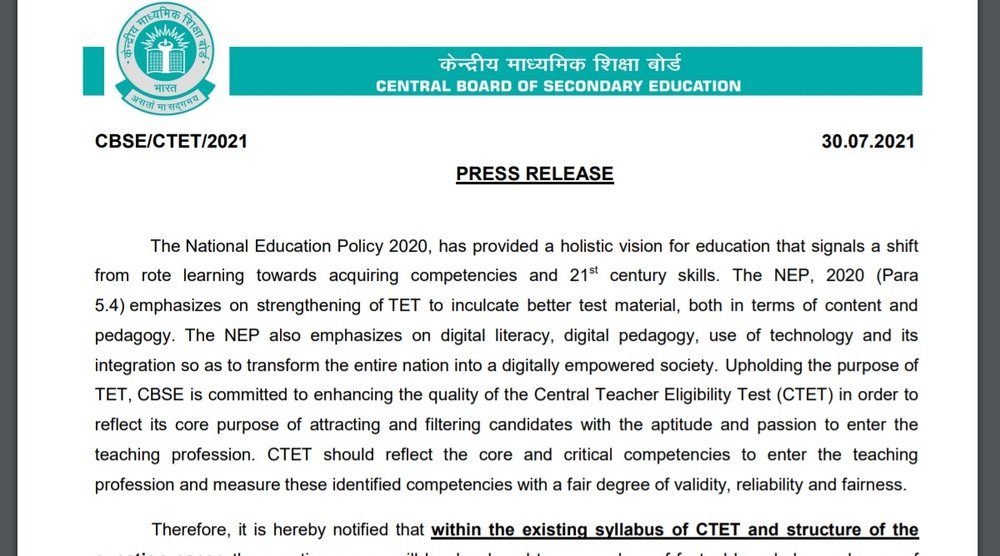 CTET Notification 2021: सेंट्रल टीचर एलिजिबिलिटी टेस्ट (CTET) के विस्तृत नोटिफिकेशन का इंतज़ार लाखों उम्मीदवार कर रहे हैं। हाल ही में सेंट्रल बोर्ड ऑफ सेकेंडरी एजुकेशन (CBSE) ने एक नोटिस जारी करके बताया था कि यह परीक्षा दिसंबर 2021 या जनवरी 2022 में आयोजित की जा सकती है। हालांकि, बोर्ड द्वारा नोटिफिकेशन जारी होने के बाद ही पूरी जानकारी मिलेगी। इस साल नई शिक्षा नीति को ध्यान में रखते हुए परीक्षा में भी कुछ अहम बदलाव किए गए हैं।