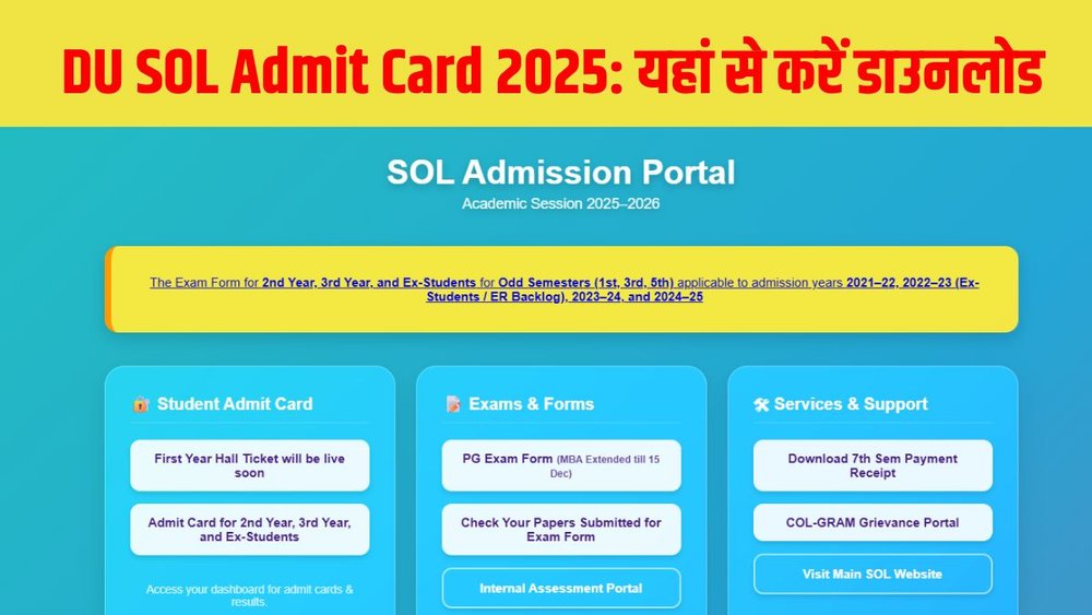दिल्ली यूनिवर्सिटी स्कूल ऑफ ओपन लर्निंग (DU SOL) ने डीयू एसओएल एडमिट कार्ड 2025 (DU SOL Admit Card 2025) को आधिकारिक रूप से जारी कर दिया है। यह एडमिट कार्ड 2nd ईयर, 3rd ईयर और Ex-Students (पूर्व छात्र) के लिए उपलब्ध है। जो भी छात्र आगामी परीक्षाओं में शामिल होने वाले हैं, वे अपना हॉल टिकट ऑफिशियल वेबसाइट sol.du.ac.in से डाउनलोड कर सकते हैं।