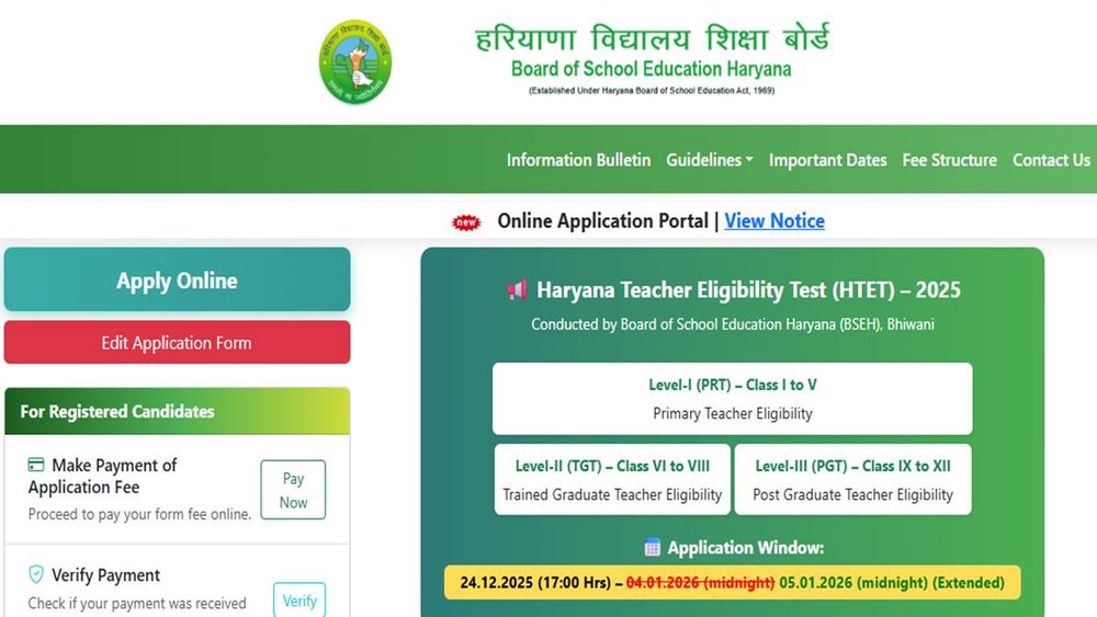 हरियाणा शिक्षक पात्रता परीक्षा 2025 के लिए रजिस्ट्रेशन की जो डेडलाइन आगे बढ़ाई गई थी वह आज (5 जनवरी 2026) रात 12 बजे समाप्त हो जाएगी। 17 और 18 जनवरी 2026 को आयोजित होने वाली इस परीक्षा के लिए जिन इच्छुक और पात्र उम्मीदवारों ने अभी तक आवेदन नहीं किया है वह हरियाणा विद्यालय शिक्षा बोर्ड (HBSE) की आधिकारिक वेबसाइट पर जाकर bseh.org.in पर जाकर अपना पंजीकरण कर सकते हैं। इसके बाद अंतिम तिथि आगे बढ़ने की संभावना काफी कम है।