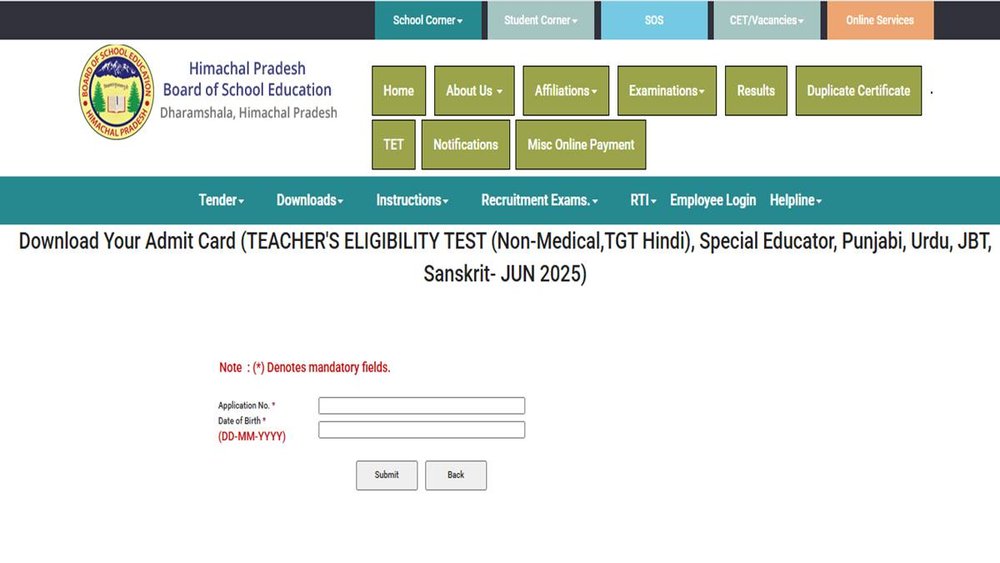 हिमाचल प्रदेश TET जून 2025 सेशन की परीक्षा के लिए जिन उम्मीदवारों ने रजिस्ट्रेशन कराया था उनके लिए हिमाचल प्रदेश स्कूल शिक्षा बोर्ड (HPBOSE) ने एडमिट कार्ड जारी कर दिए हैं। उम्मीदवार बोर्ड की ऑफिशियल वेबसाइट hpbose.org से प्रवेश पत्र को डाउनलोड कर सकते हैं। जो उम्मीदवार इस जूनियर बेसिक ट्रेनिंग (JBT) और प्रशिक्षित स्नातक शिक्षक (TGT) संस्कृत के पेपर में परीक्षा में शामिल होने वाले हैं वह परीक्षा की तारीख से पहले प्रवेश पत्र को डाउनलोड कर लें।