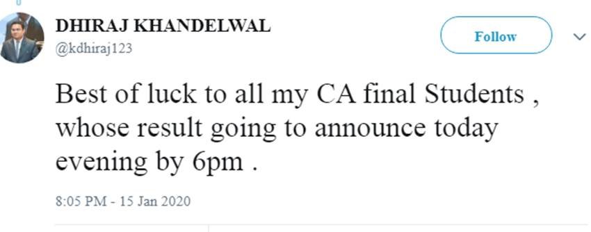 ICAI के केंद्रीय परिषद सदस्य धीरज खंडेलवाल बुधवार को ट्वीट कर CA फाइनल परिणाम जारी होने की तारीख और समय के बारे में बताया था। उन्होंने ट्वीट कर बताया कि, 'आज शाम 6 बजे तक रिजल्ट जारी कर दिए जाएंगे। मेरे सभी सीए फाइनल स्टूडेंट्स को शुभकामनाएं, जिनका रिजल्ट आज शाम 6 बजे तक घोषित होने वाला है।'