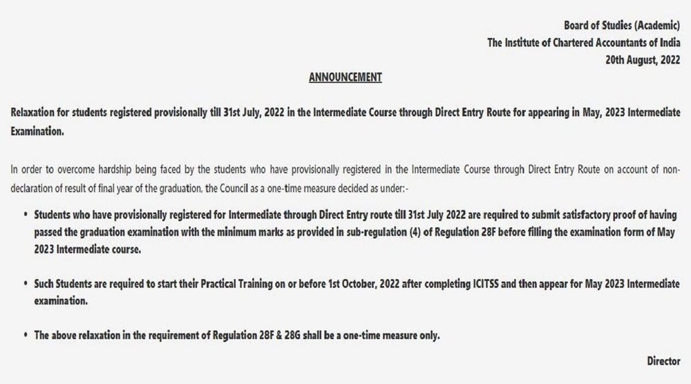 आधिकारिक नोटिस के अनुसार, इन सभी अभ्यर्थियों को मई 2023 इंटरमीडिएट पाठ्यक्रम के परीक्षा फॉर्म को भरने से पहले विनियमन 28F के उप-विनियम (4) में प्रदान किए गए न्यूनतम अंकों के साथ स्नातक परीक्षा उत्तीर्ण करने का प्रमाण प्रस्तुत करना आवश्यक है।
