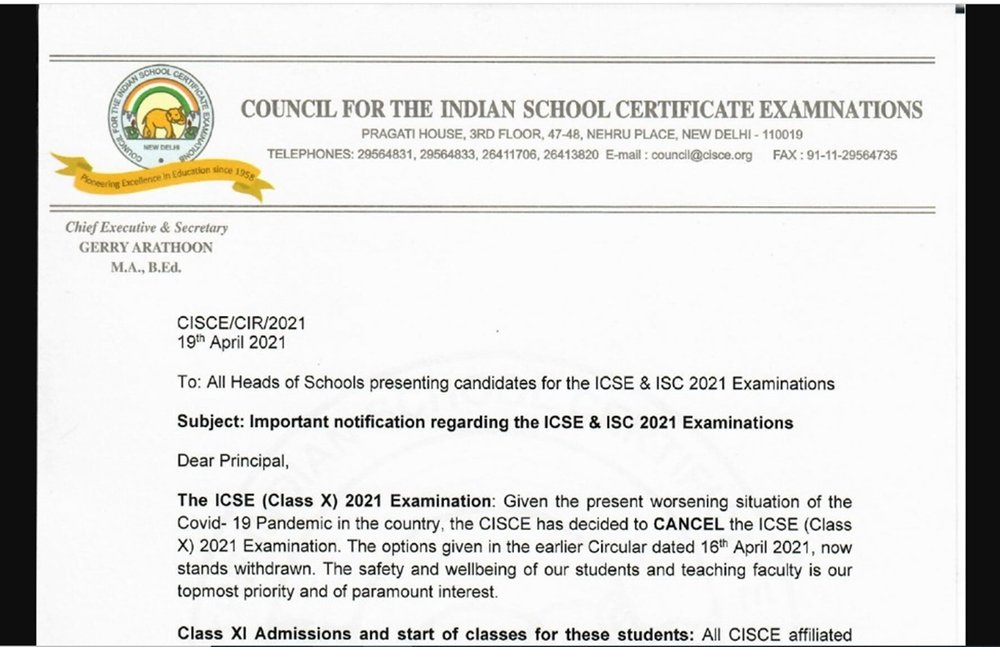 काउंसिल फॉर द इंडियन स्कूल सर्टिफिकेट एग्जामिनेशन (CISCE) ने ICSE को रद्द करने की घोषणा की, परीक्षा को स्थगित करने और छात्रों को बाद की तारीख के पहले के फैसले को पलट दिया है। हालांकि, आईएससी परीक्षा स्थगित हो गई, बोर्ड ने स्कूलों को भेजे गए पत्र में स्पष्ट किया है। परिषद ने एक बयान में कहा “देश में कोविड -19 महामारी की वर्तमान स्थिति को देखते हुए, CISCE ने ICSE (कक्षा X) 2021 परीक्षा को रद्द करने का निर्णय लिया है। पहले 16 अप्रैल को सर्कुलर में दिए गए विकल्प को अब वापस ले लिया है। सुरक्षा और हमारे छात्रों और शिक्षण संकाय की भलाई हमारी सर्वोच्च प्राथमिकता और सर्वोपरि हित है।”