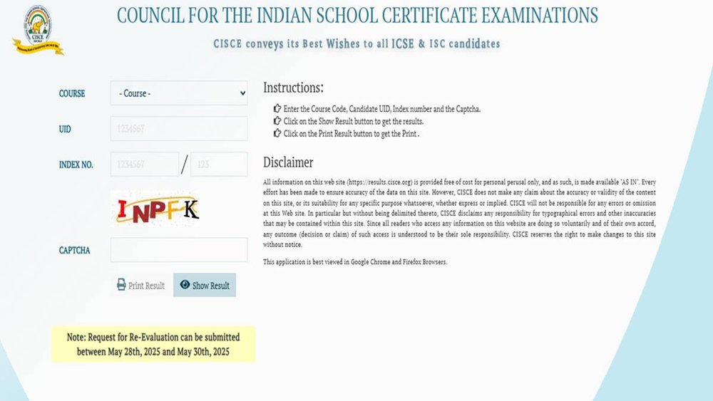 रिजल्ट चेट करने के लिए आधिकारिक वेबसाइट cisce.org पर जाएं। रिजल्ट का डायरेक्ट लिंक recheckresults.cisce.org ओपन होगा। यहां आपको सबसे पहले अपना कोर्स सेलेक्ट करना है। फिर अपना UID नंबर और इंडेक्स नंबर के साथ-साथ कैप्चा कोड दर्ज करें और Show Result पर क्लिक करें। अब रिजल्ट आपकी स्क्रीन पर आ जाएगा। इसका प्रिंट आउट निकाल लें।