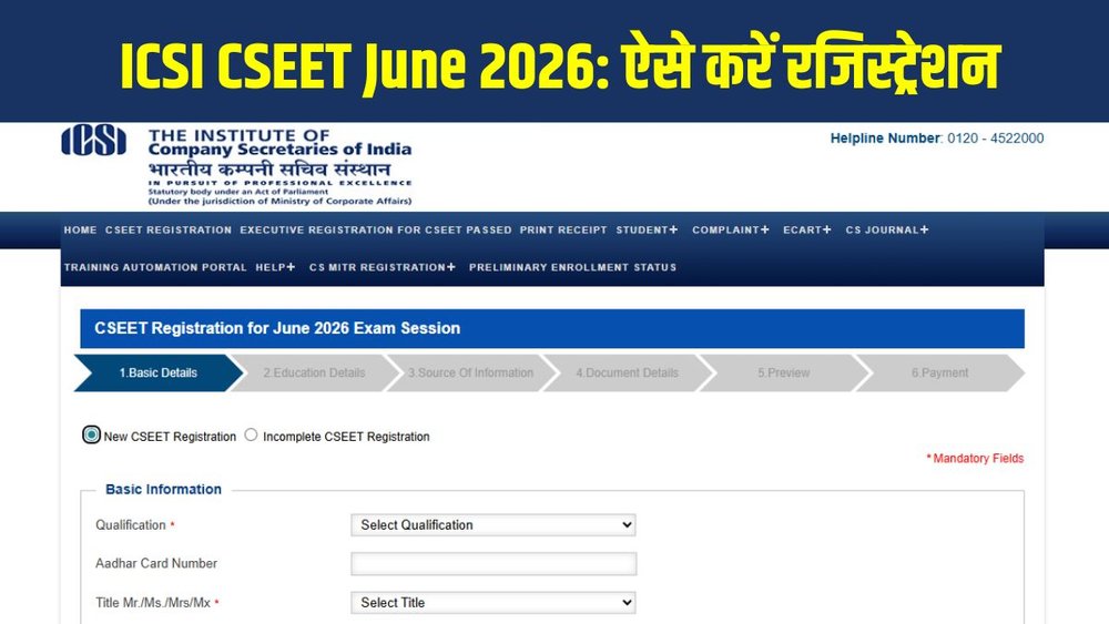 इंस्टीट्यूट ऑफ कंपनी सेक्रेटरीज ऑफ इंडिया (ICSI) ने कंपनी सेक्रेटरी एग्जीक्यूटिव एंट्रेंस टेस्ट (CSEET) जून 2026 सत्र के लिए रजिस्ट्रेशन प्रक्रिया शुरू कर दी है। इच्छुक और पात्र उम्मीदवार आधिकारिक पोर्टल smash.icsi.edu के माध्यम से ऑनलाइन आवेदन कर सकते हैं। सीएसईईटी परीक्षा, सीएस एग्जीक्यूटिव प्रोग्राम में प्रवेश के लिए अनिवार्य है। जो उम्मीदवार भारत में एक प्रोफेशनल कंपनी सेक्रेटरी (CS) के रूप में करियर बनाना चाहते हैं, उनके लिए यह परीक्षा पहला महत्वपूर्ण कदम है।