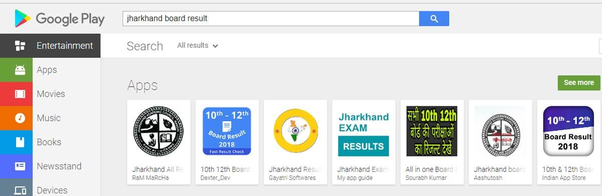 नतीजे देखने के लिए एंड्रॉइड स्मार्टफोन यूजर्स इन ऐप्स की मदद ले सकते हैं। गूगल प्ले स्टोर में जाकर सर्च बॉक्स में JAC results या Jharkhand Board results टाइप करें। रेटिंग्स के हिसाब से बेस्ट ऐप चुनें।