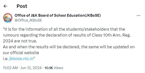 जम्मू-कश्मीर बोर्ड ने हाल ही में कक्षा 10वीं परिणाम 2024 की घोषणा की फर्जी खबरों का पर्दाफाश करने के लिए ट्विटर पर एक पोस्ट के जरिए स्टूडेंट्स को सावधान किया था। JKBOSE ने कहा था कि रिजल्ट को लेकर सोशल मीडिया पर कक्षा 10वीं वार्षिक परीक्षा 2024 के परिणामों की घोषणा के बारे में अफवाहें सच नहीं हैं। जब भी परिणाम घोषित किए जाएंगे, उन्हें हमारी आधिकारिक वेबसाइट https://jkbose.nic.in पर अपडेट कर दिया जाएगा।”