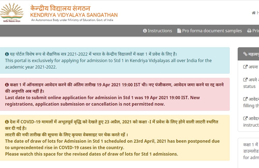KVS Admission 2021: केन्द्रीय विद्यालय संगठन, केवीएस प्रवेश 2021 कक्षा 1 की मेरिट लिस्ट जारी करने की तारीख को स्थगित कर दिया गया है। मेरिट लिस्ट और वेटिंग लिस्ट कल, 23 अप्रैल, 2021 को जारी होने वाली थी। देश में COVID 19 मामलों के बढ़ने के कारण, KVS कक्षा 1 की प्रवेश सूची 2021 जारी करने की तारीख को स्थगित कर दिया गया है। KVS एडमिशन 2021 कक्षा 1 की प्रोविजनल मेरिट लिस्ट को स्थगित करने की आधिकारिक घोषणा या नोटिस kvsonlineadmission.kvs.gov.in पर जारी किया गया है। आधिकारिक साइट के अनुसार, प्रवेश प्रक्रिया के लिए संशोधित तारीख केवीएस द्वारा आधिकारिक वेबसाइट पर जारी की जाएगी।