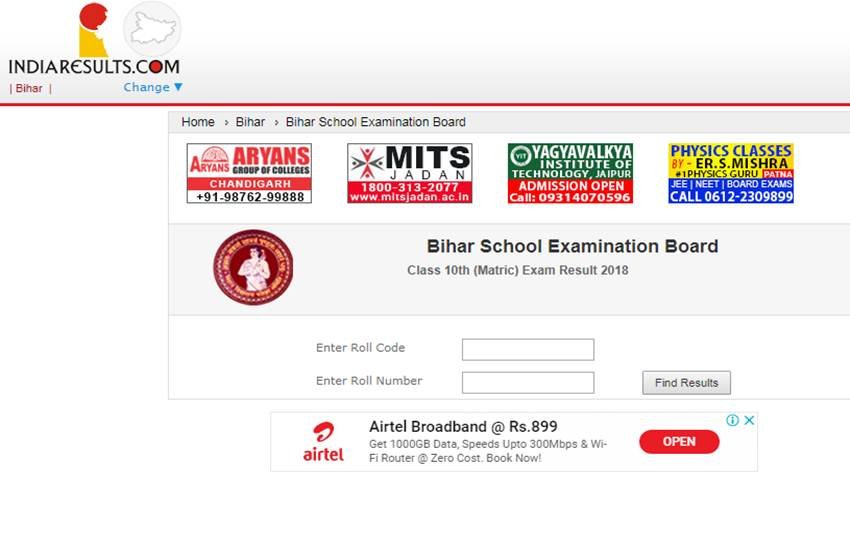 नतीजे आप थर्ड पार्टी वेबसाइट bihar.indiaresults.com पर भी देख सकते हैं। नतीजे देखने के लिए लॉगइन करें वेबसाइट पर। वेबसाइट पर जाकर 'Bihar Board BSEB 10th Result 2018, बिहार बोर्ड मैट्रिक 10वीं रिजल्ट 2018' के लिंक पर क्लिक करें। अपना रोल नंबर सबमिट करने के बाद आप नतीजे देख सकते हैं।