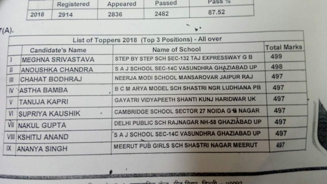 गाजियाबाद की मेघना श्रीवास्तव पहली पोजिशन पर हैं। वहीं गाजियाबाद की ही अनुष्का चंद्रा ने दूसरा स्थान प्राप्त किया है। उन्होंने 500 में से 498 अंक हासिल किए हैं। वहीं तीसरे स्थान पर चाहत बोधराज 497 अंक के साथ हैं।