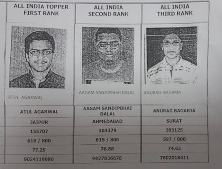 जयपुर के अतुल अग्रवाल ने टॉप किया है। अतुल के 618 नंबर आए हैं। अहमदाबाद के अगम संदिपभाई दलाल 615 नंबर के साथ दूसरे नंबर पर हैं। वहीं तीसरे नंबर पर अनुराग हैं। अनुराग के 597 नंबर हैं।