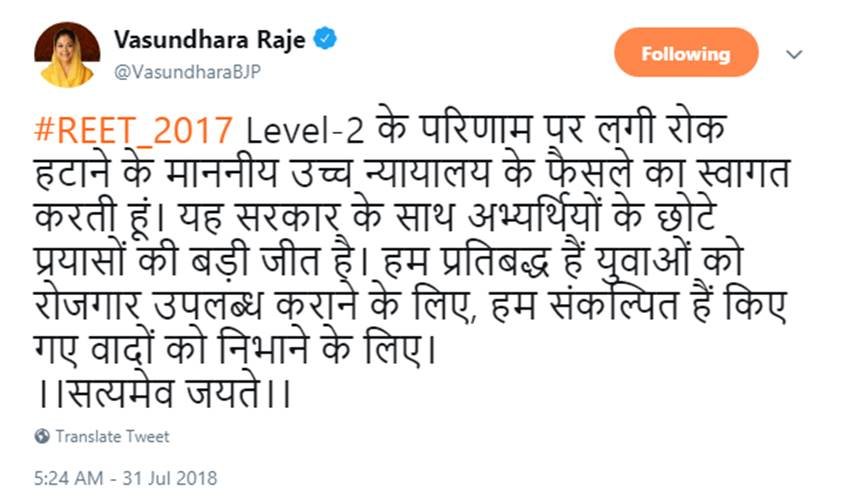 BSER REET Level 2 Result 2018: राजस्थान माध्यमिक शिक्षा बोर्ड ने मंगलवार (31 जुलाई) को राजस्थान एलिजिबिलिटी एग्जामिनेशन फॉर टीचर्स (REET) Level 2 के परीक्षा परिणाम घोषित कर दिए। मुख्यमंत्री वसुंधरा राजे ने REET Level 2 के परिणाम पर लगी रोक हटाने के बाद कहा कि वह माननीय उच्च न्यायालय के फैसले का स्वागत करती हैं। यह सरकार के साथ अभ्यर्थियों के छोटे प्रयासों की बड़ी जीत है। उनकी सरकार युवाओं को रोजगार मुहैया कराने के लिए प्रतिबद्ध है।