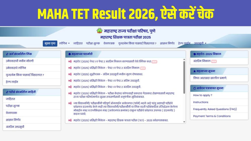 योग्यता प्रमाण पत्र, शिक्षक भर्ती और आगे की प्रक्रिया से जुड़ी जानकारी के लिए नियमित रूप से mahatet.in वेबसाइट विजिट करते रहें। MAHA TET पास करने वाले उम्मीदवार महाराष्ट्र में होने वाली शिक्षक भर्ती (Teacher Recruitment) प्रक्रियाओं में आवेदन के लिए पात्र माने जाएंगे।
