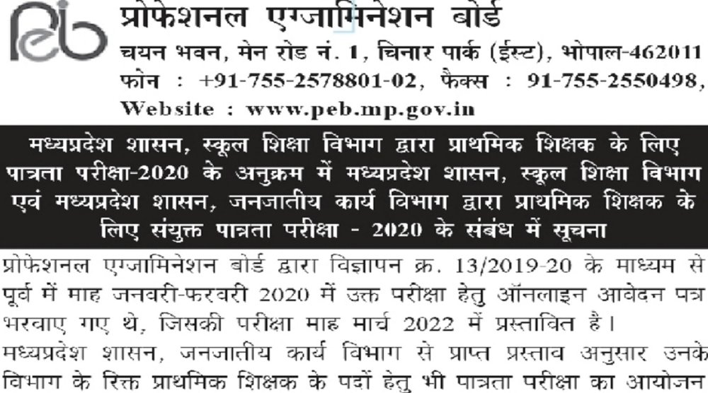 इसके लिए 14 दिसंबर 2021 से आवेदन किया जा सकेगा और आवेदन प्रक्रिया 28 दिसंबर 2021 तक जारी रहेगी। जो कैंडीडेट्स आवेदन करना चाहते हैं, वे आधिकारिक वेबसाइट peb.mponline.gov.in पर विजिट कर सकते हैं।