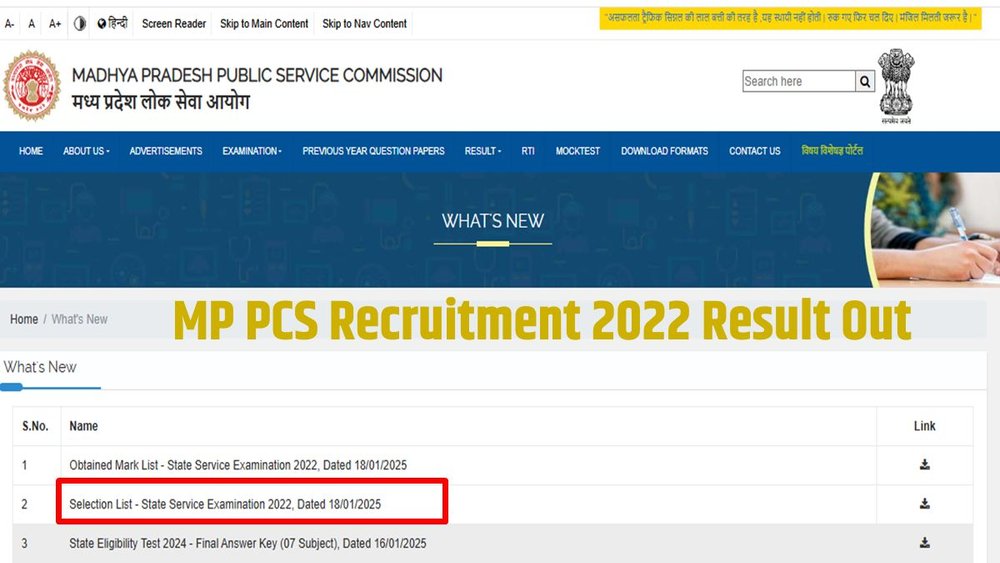 मध्य प्रदेश लोक सेवा आयोग (MPPSC) ने राज्य सेवा परीक्षा 2022 (मुख्य परीक्षा) का रिजल्ट जारी कर दिया है। यह परीक्षा जनवरी 2024 में 8 से 13 तारीख के बीच में आयोजित हुई थी। इस एग्जाम में जो कैंडिडेट उपस्थित हुए थे वह आयोग की आधिकारिक वेबसाइट mppsc.mp.gov.in पर जाकर रिजल्ट चेक कर लें। आयोग ने पीडीएफ फॉर्मेट में रिजल्ट जारी किया है। उस पीडीएफ फाइल में उन कैंडिडेट्स के नाम और रोल नंबर हैं जिन्होंने मुख्य परीक्षा के बाद आयोजित हुए इंटरव्यू में क्वालीफाई कर लिया है।