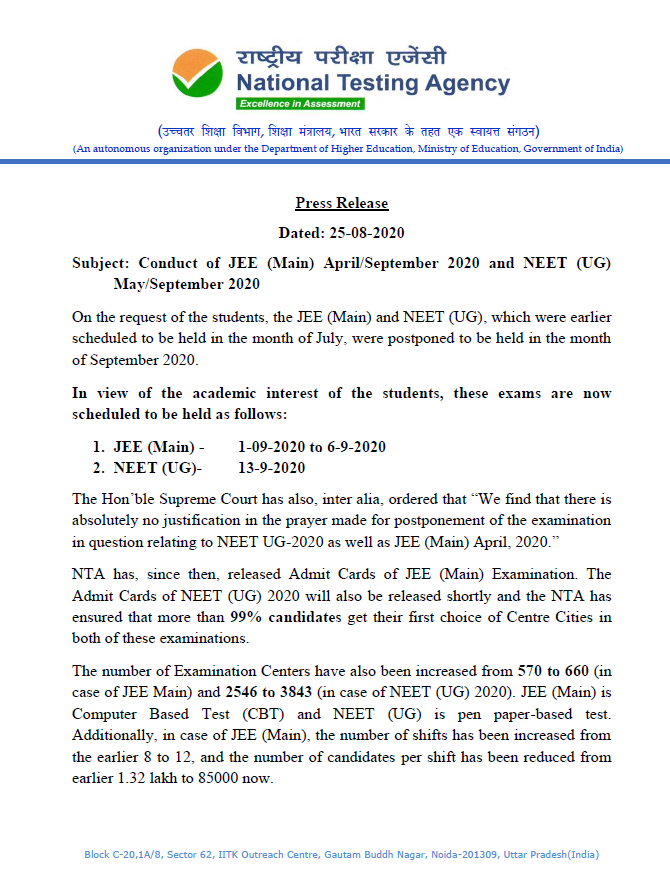 नेशनल टेस्टिंग एजेंसी ने नीट -यूजी और जेईई मेन 2020 परीक्षाओं के लिए डिटेल्ड सेफ्टी प्लान जारी किया है. यूनियन गवर्नमेंट ने तमाम विरोधों के बावजूद यह साफ किया है कि न तो जेईई मेन परीक्षा 2020 और न ही नीट परीक्षा 2020 किसी भी कीमत पर स्थगित होगी।