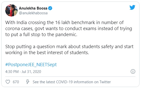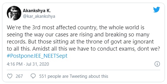 मानव संसाधन विकास मंत्री रमेश पोखरियाल “निशंक” ने कई उदाहरणों में कहा कि सरकार की प्राथमिकता छात्रों का स्वास्थ्य और सुरक्षा है। भारत ने कोरोना मामलों में 17 लाख बेंचमार्क को पार करने के साथ, महामारी पर पूर्ण विराम लगाने की कोशिश करने के बजाय परीक्षा आयोजित करना चाहता हैं। छात्रों की सुरक्षा के बारे में सवालिया निशान लगाना बंद करें और छात्रों के सर्वोत्तम हित में काम करना शुरू करें, “राष्ट्रीय छात्र संघ (एनएसयूआई) के राष्ट्रीय सचिव अनुलेखा बूसा ने कहा। एक ट्विटर यूजर ने पूछा “हम दुनिया के तीन सबसे प्रभावित देशों में हैं। पूरा दुनिया देख रही है कि भारत में किस तरह से मामले बढ़ रहे हैं। क्या इन सबके बीच हमें परीक्षा आयोजित करनी होगी?