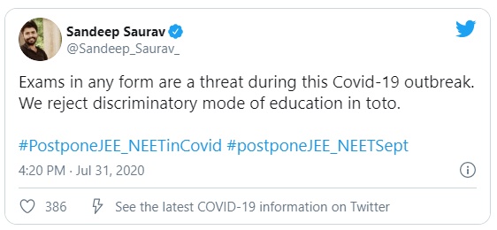 सर्वोच्च न्यायालय ने 31 अगस्त को केंद्र से अंतिम वर्ष की परीक्षा पर अपना रुख स्पष्ट करने के लिए कहा और मामले को 10 अगस्त तक के लिए स्थगित कर दिया। शीर्ष अदालत के फैसले के तुरंत बाद, इंजीनियरिंग और मेडिकल एस्पिरेंट्स ने “postpone JEE 2020” और “postpone NEET 2020” की सोशल मीडिया पर मांग शुरू कर दी। “किसी भी रूप में परीक्षा इस कोविड -19 के प्रकोप के दौरान एक खतरा है। ऑल इंडिया स्टूडेंट्स एसोसिएशन (AISA) के राष्ट्रीय महासचिव संदीप सौरव ने सोशल मीडिया पर कहा, “हम शिक्षा में भेदभावपूर्ण विधा को अस्वीकार करते हैं”।