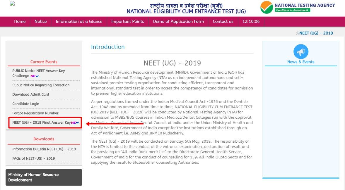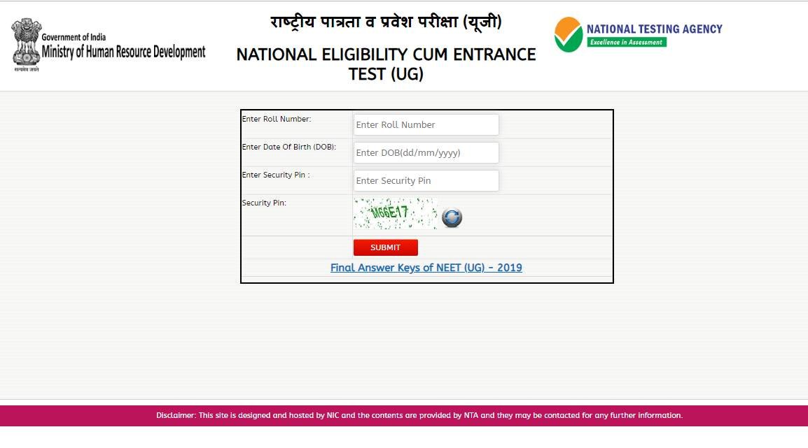 NTA ने NEET 2019 परीक्षा की अंतिम उत्तर कुंजी वेबसाइट पर जारी कर दी है। छात्र फौरन ntaneet.nic.in पर विजिट कर आंसर की डाउनलोड करें।
