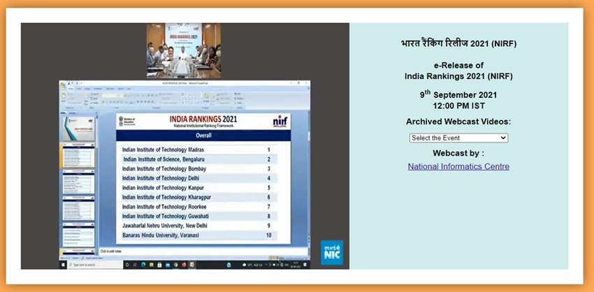 NIRF Ranking 2021: केंद्रीय शिक्षा मंत्री धर्मेंद्र प्रधान साल 2021 की नेशनल इंस्टीट्यूशनल रैंकिंग फ्रेमवर्क (एनआईआरएफ) रैंकिंग जारी कर दी है। कोरोना के चलते पिछले साल की तरह इस साल भी रैंकिग जारी करने का कार्यक्रम ऑनलाइन हुआ। शिक्षा मंत्री द्वारा एनआईआरएफ रैंकिंग कुल 11 कैटेगरी में जारी किया गया है। इनमें ओवरऑल, यूनिवर्सिटी, मैनेजमेंट, कॉलेज, फार्मेसी, मेडिकल, इंजीनियरिंग, आर्किटेक्चर, एआरआईआईए (नवाचार उपलब्धियों पर संस्थानों की अटल रैंकिंग) और लॉ शामिल हैं। रैंक चेक करने के लिए ऑफिशियल वेब साइटnirfindia.org है।