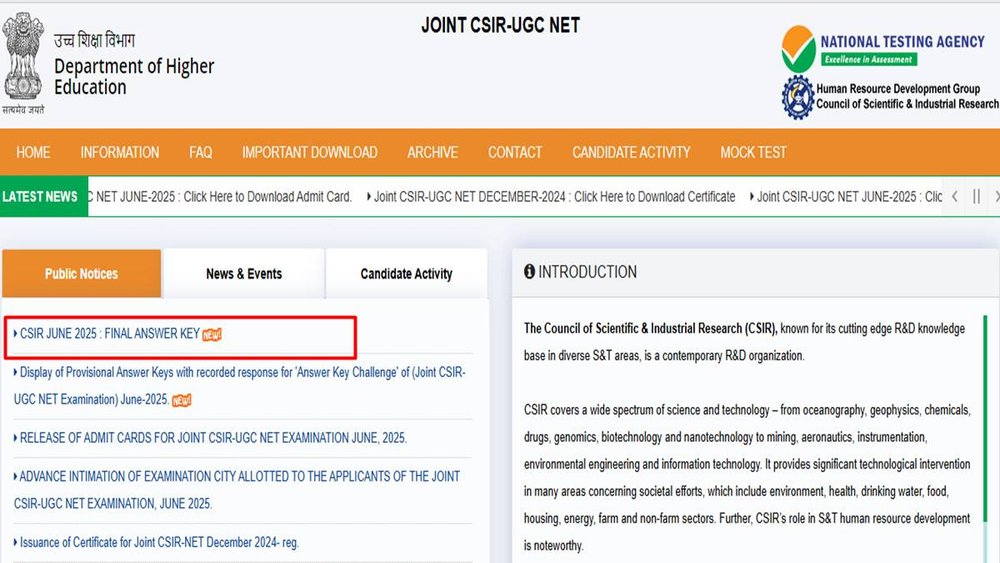 वेबसाइट के होम पेज पर Public Notice सेक्शन में CSIR JUNE 2025 : FINAL ANSWER KEY लिंक पर क्लिक करें।