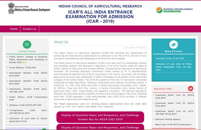 NTA ICAR AIEEA Answer Key 2019: नेशनल टेस्टिंग एजेंसी ने भारतीय कृषि अनुसंधान परिषद अखिल भारतीय प्रवेश परीक्षा (AIEEA) (UG), ICAR- AIEEA (PG) और ICAR- AICE-JRF / SRF (PGS) परीक्षाओं की उत्तर कुंजी जारी कर दी है। परीक्षार्थी उत्तर कुंजी एजेंसी की आधिकारिक वेबसाइट ntaicar.nic.in पर विजिट कर डाउनलोड कर सकते हैं। परीक्षा 01 जुलाई, 2019 को आयोजित की गई थी। परीक्षा के रिजल्ट 17 जुलाई, 2019 को घोषित किए जाएंगे, जिसके बाद काउंसलिंग की प्रक्रिया शुरू होगी।