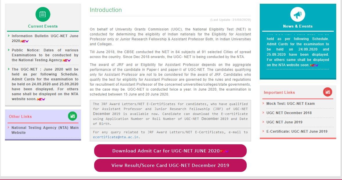 UGC NET 2020 की परीक्षाएं अब 24 सितंबर, 25, 29 और 30 अक्टूबर, 1, 7, 9, 17, 21, 22, 23 और 10 नवंबर, 2020 को आयोजित होने वाली हैं। 24 और 25 सितंबर को होने वाली परीक्षा के लिए एडमिट कार्ड आधिकारिक वेबसाइट ugcnet.nta.nic.in पर जारी किया गया है।