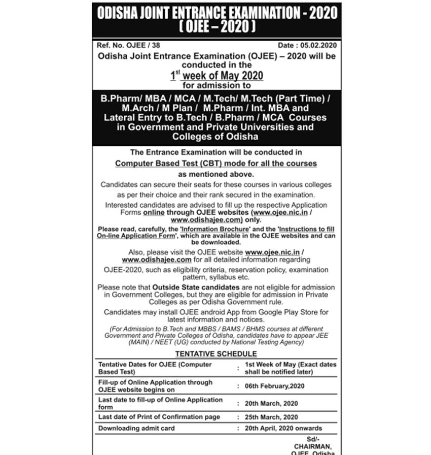 OJEE 2020 Registration, Application Form: ओडिशा ज्वाइंट एंट्रेंस एग्जाम (Odisha Joint Entrance Examination, OJEE) 2020 के लिए आवेदन की प्रक्रिया गुरुवार (06 फरवरी 2020) से शुरू हो चुकी है। इच्छुक और योग्य उम्मीदवार आधिकारिक वेबसाइट ojee.nic.in या odishajee.com. पर जाकर रजिस्ट्रेशन कर सकते हैं। ऑनलाइन रजिस्ट्रेशन की आखिरी तारीख 20 मार्च 2020 तक है। ओडिशा स्थित कॉलेजों में बीफार्मा, इंटीग्रेटेड एमबीए, लेटरल एंट्री, बीएससी, एमसीए / एमबीए / एमएर्च / एमफार्मा / एमपीएएल / पीजीएटी / पीजीएटी का अध्ययन करने के इच्छुक उम्मीदवारों को परीक्षा के लिए पंजीकरण कराना आवश्यक है। एंट्रेंस एग्जाम का एडमिट कार्ड 20 अप्रैल 2020 को आधिकारिक वेबसाइट पर अपलोड कर दिए जाएंगे और एग्जाम मई 2020 के पहले सप्ताह में आयोजित की जाएगी। हालांकि अभी तक एग्जाम की डेट की आधिकारिक घोषणा नहीं की गई है।