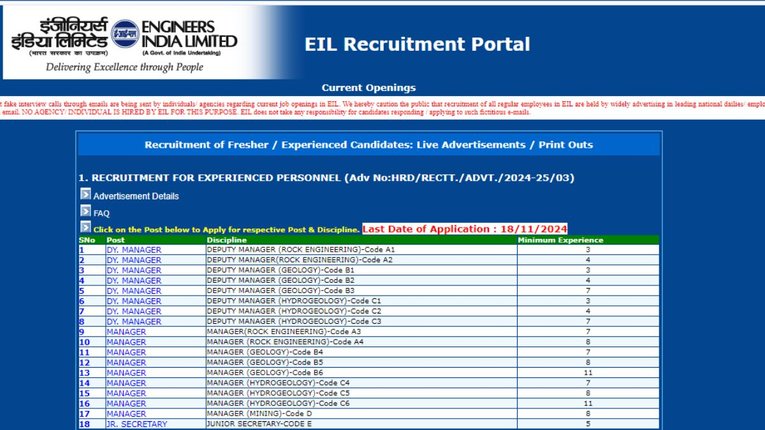 EIL Recruitment 2024: इंजीनियर्स इंडिया लिमिटेड द्वारा जारी की गई भर्तियों के लिए आवेदन तिथियों से लेकर चयन प्रक्रिया तक…