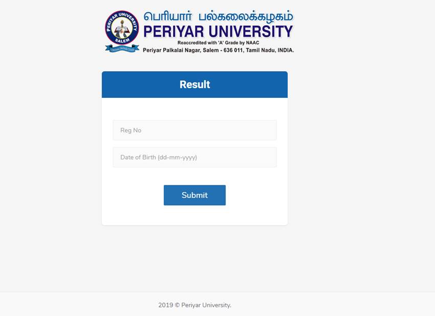 कैसे देखें अपना रिजल्ट: स्टूडेंट्स को अपना रिजल्ट देखने के लिए यूनिवर्सिटी की वेबसाइट http://www.periyaruniversity.ac.in पर जाना होगा। यहां दायीं तरफ News सेक्शन में 04 JAN 2019 November 2018 Examinations – PG -Result (University Departments) – Student login पर क्लिक करें। एक नया पेज खुलेगा। इसमें दूसरा विकल्प November 2018 Examinations – (UG/PG) -Result (Affiliated Colleges) – Student login चुनें। नए पेज पर आपसे रोल नंबर/रजिस्ट्रेशन नंबर तथा जन्मतिथि पूछी जाएगी। जानकारी भरने के बाद सबमिट करने पर आपकी मार्कशीट स्क्रीनपर होगी।