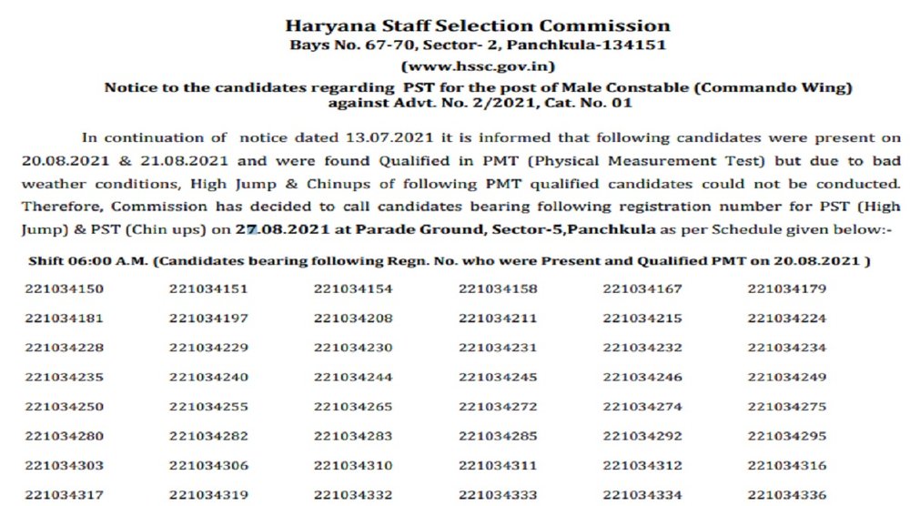 कमांडो फिजिकल टेस्ट में पास होने वाले कैंडिडेट्स को 60 अंकों की लिखित परीक्षा के लिए बुलाया जाएगा। हरियाणा कर्मचारी चयन आयोग (HSSC) ने जून 2021 के महीने में पुलिस विभाग कांस्टेबल पद के कमांडो विंग (ग्रुप सी) में 520 पुरुष कांस्टेबल पदों को भरने के लिए नोटिफिकेशन जारी की थी।