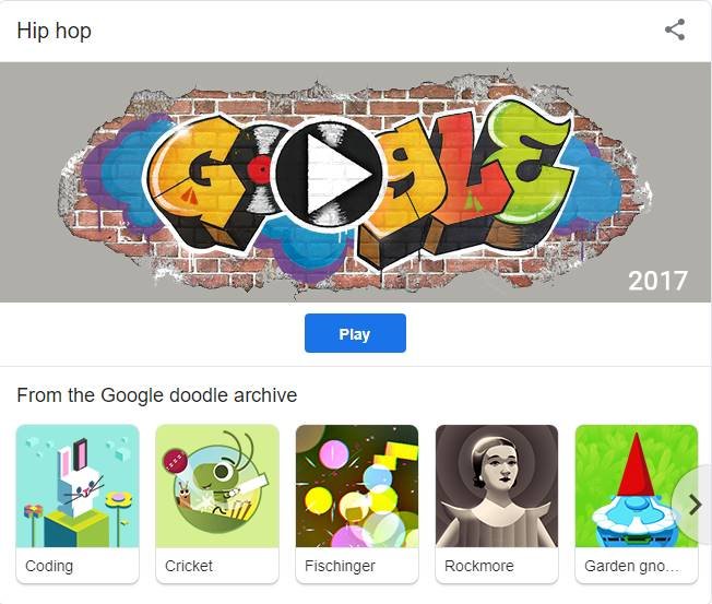 होम एंड प्ले एट होम विद पॉपुलर पास्ट गूगल डूडल्स: हिप हॉप (2017) का आज का गूगल डूडल कुछ इस तरह बना है, गूगल का पहला G एक ड्रम मास्टर है जिसके हाथ में ड्रम स्टिक्स हैं और दोनों O's को पीट-पीटकर ड्रम बजा रहा है। अगला 'g' में कुछ मजेदार तरीकों से ब्रेक डांस फॉर्म दिखा रहा है। ।