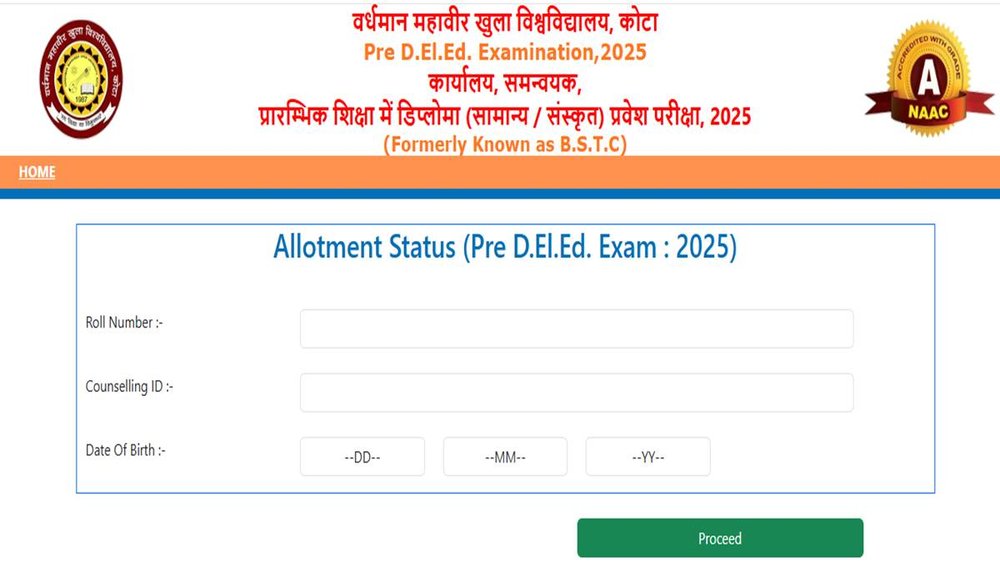 राजस्थान बीएसटीसी प्री डीएलएड प्रवेश परीक्षा पास करने के बाद काउंसलिंग प्रक्रिया का हिस्सा रहे उम्मीदवारों के लिए वर्धमान महावीर ओपन यूनिवर्सिटी ने अब पहली सीट आवंटन सूची जारी कर दी है। इस सूची को देखने व डाउनलोड करने के लिए कैंडिडेट्स आधिकारिक वेबसाइट predeledraj2025.in पर विजिट करें। वेबसाइट पर जाकर उम्मीदवारों को अपने रोल नंबर, काउंसलिंग आईडी और जन्मतिथि का इस्तेमाल करके अपना Allotment Status पता कर सकते हैं।
