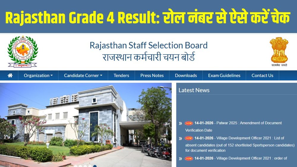 राजस्थान कर्मचारी चयन बोर्ड (RSSB) ने राजस्थान ग्रेड 4 परिणाम 2025-26 (Rajasthan Grade 4 Result 2025-26) घोषित कर दिया है। यह परीक्षा 19 से 21 सितंबर 2025 के बीच आयोजित की गई थी, जिसमें लगभग 21 लाख उम्मीदवारों ने भाग लिया था। RSSB के चेयरमैन आलोक राज ने सोशल मीडिया प्लेटफॉर्म X (पूर्व में ट्विटर) के माध्यम से जानकारी दी कि राजस्थान ग्रेड 4 भर्ती परीक्षा का रिजल्ट 15 जनवरी 2026 को घोषित कर दिया गया है, जबकि अभ्यर्थी 16 जनवरी 2026 से रिजल्ट PDF डाउनलोड कर सकेंगे।