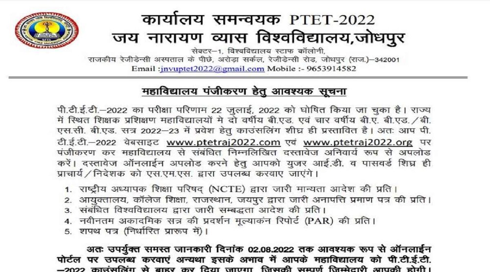 Rajasthan PTET Counselling 2022: जय नारायण व्यास विश्वविद्यालय, राजस्थान की ओर से जल्द ही पीटीईटी 2022 के लिए काउंसलिंग की प्रक्रिया शुरू की जाएगी। विश्वविद्यालय ने काउंसलिंग के संबंध में अपनी आधिकारिक वेबसाइट ptetraj2022.org पर नोटिस जारी किया है। नोटिस महाविद्यालय पंजीकरण के संबंध में जारी किया गया है।