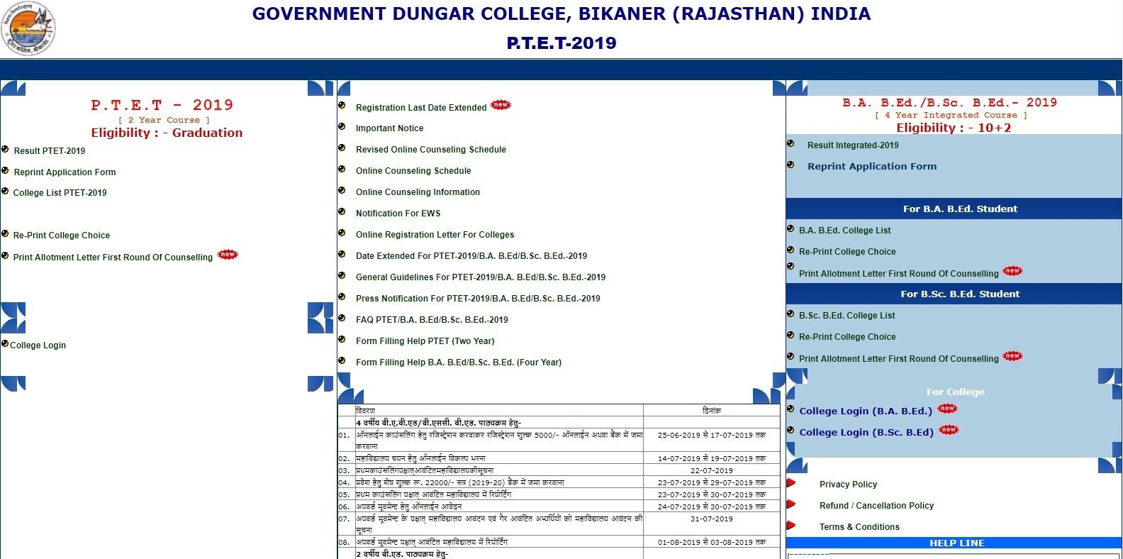 राजस्थान ptet 2019 अधिसूचना के अनुसार ग्रेजुएट उम्मीदवारों को 2 वर्ष के बीएड कोर्स के साथ ही साथ 10+2 उम्मीदवार 4 वर्ष का इंट्रीग्रेटेड कोर्स बीए.बीएड / बीएससी.बीएड के लिए आवेदन कर सकते थे। इस साल से rajasthan ptet 2019 की परीक्षा डूंगर कॉलेज, बीकानेर के द्वारा आयोजित की गई थी।
