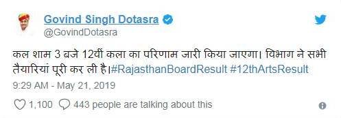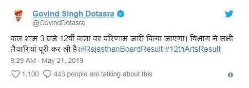 राजस्थान राज्य के शिक्षा मंत्री गोविंद सिंह ने ट्वीट कर रिजल्ट जारी होने की तिथि की आधिकारिक पुष्टि की है।
