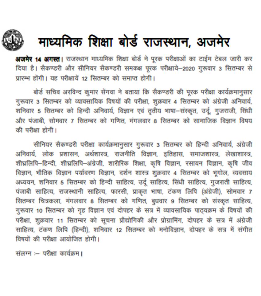 बोर्ड सचिव अरविंद कुमार सेंगवा के मुताबिक, 10वीं क्लास की सप्लीमेंट्री परीक्षा 03 सितंबर को व्यावसायिक विषयों से शुरू होगी जबकि 03 सितंबर को सीनियर सेकंडरी की सप्लीमेंट्री परीक्षा हिंदी अनिवार्य, अंग्रेजी, लोक प्रशासन, अर्थशास्त्र, राजनीति विज्ञान, इतिहास, समाजशास्त्र, लेखाशास्त्र, शीघ्रलिपी-हिंदी, शीघ्रलिपी-अंग्रेजी, फिजिकल एजुकेशन, कृषि विज्ञान, कृषि जीव विज्ञान, रसायन विज्ञान, भौतिक विज्ञान पर्यावरण विज्ञान और दर्शन शास्त्र से शुरू होगी। 10वीं की अंतिम पूरक परीक्षा 08 सितंबर को सामाजिक विज्ञान की होगी तो 12वीं की अंतिम परीक्षा 12 सितंबर को मनोविज्ञान विषय और दोपहर की शिफ्ट में संगीत विषय की होगी।