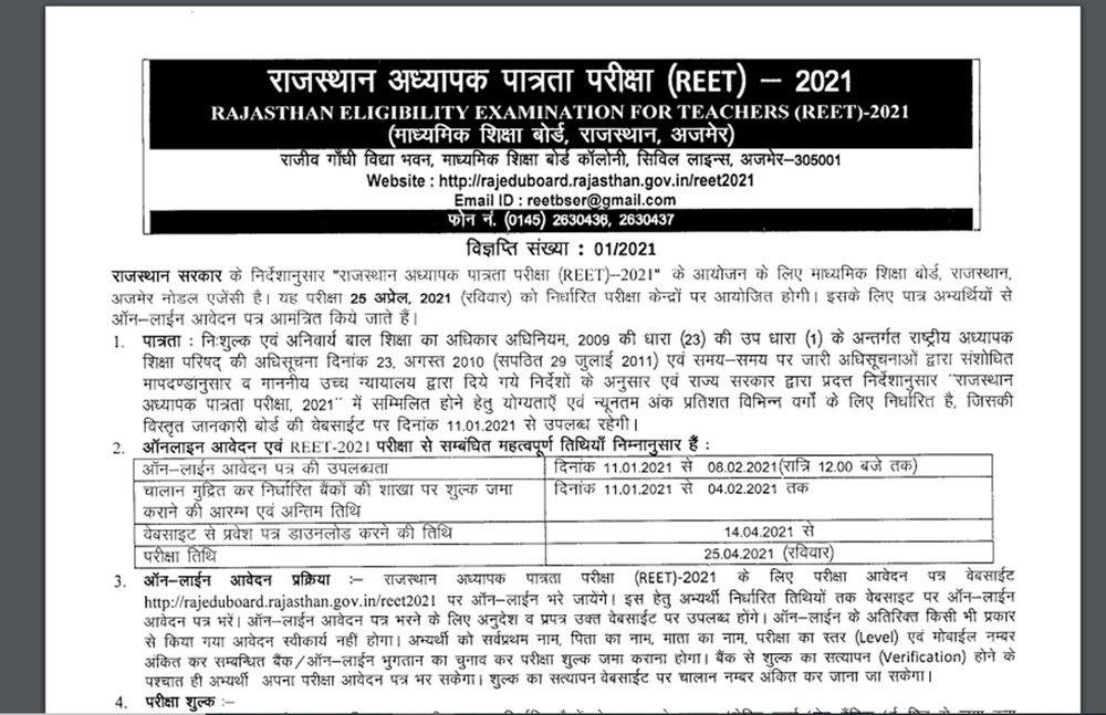राजस्थान पात्रता परीक्षा (टीईटी) 2021 के लिए आवेदन प्रक्रिया reetbser21.com, rajashan.gov.in, या rajeduboard.rajasthan.gov.in पर शुरू हो गई है। उम्मीदवार 8 फरवरी तक आवेदन कर सकते हैं। चालान के माध्यम से शुल्क जमा करने की आखिरी तारीख 4 फरवरी है। परीक्षा 25 अप्रैल को होगी और आधिकारिक अधिसूचना के अनुसार एडमिट कार्ड 14 अप्रैल को जारी किया जाएगा। परीक्षा दो भागों में आयोजित की जाएगी। जो लोग भाग -1 पास करते हैं, वे कक्षा 1 से 5 तक पढ़ाने के लिए पात्र होंगे और जो भाग -2 की परीक्षा पास करेंगे, वे कक्षा 6 से 8 तक पढ़ाने के पात्र होंगे। दोनों परीक्षाएं 150 अंकों की होंगी और उम्मीदवारों को ढाई घंटे का समय दिया जाएगा।