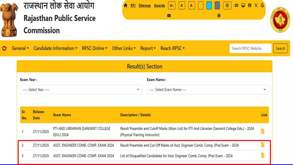 राजस्थान लोक सेवा आयोग (RPSC) ने असिस्टेंट इंजीनियर (AE) प्रीलिम्स परीक्षा का परिणाम जारी कर दिया है। 28-30 सितंबर 2025 के बीच आयोजित हुई इस परीक्षा में जो कैंडिडेट उपस्थित हुए थे वह आयोग की आधिकारिक वेबसाइट rpsc.rajasthan.gov.in पर परिणाम चेक कर सकते हैं। आयोग ने इसी वेबसाइट पर कटऑफ मार्क्स और अयोग्य घोषित उम्मीदवारों की लिस्ट भी जारी की है। साथ ही वेबसाइट पर मेंस परीक्षा के लिए शॉर्टलिस्ट हुए उम्मीदवारों की लिस्ट भी है।