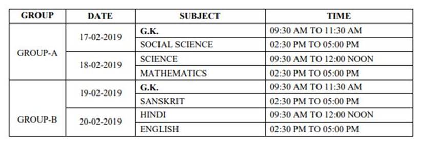 संस्कृत शिक्षक पदों होने वाली भर्ती परीक्षा को ग्रुप ए और ग्रुप बी में बांटा गया है। पहली परीक्षा 17-18 फरवरी, 2019 को आयोजित होगी, जिसमें जनरल नॉलेज (सामान्य ज्ञान), सोशल साइंस और गणित की परीक्षा होगी। जबकि ग्रुप बी के एग्जाम का आयोजन 19 और 20 फरवरी को किया जा रहा है, इसमें सामान्य ज्ञान, संस्कृत, हिंदी और अंग्रेजी विषयों की परीक्षा ली जाएगी।